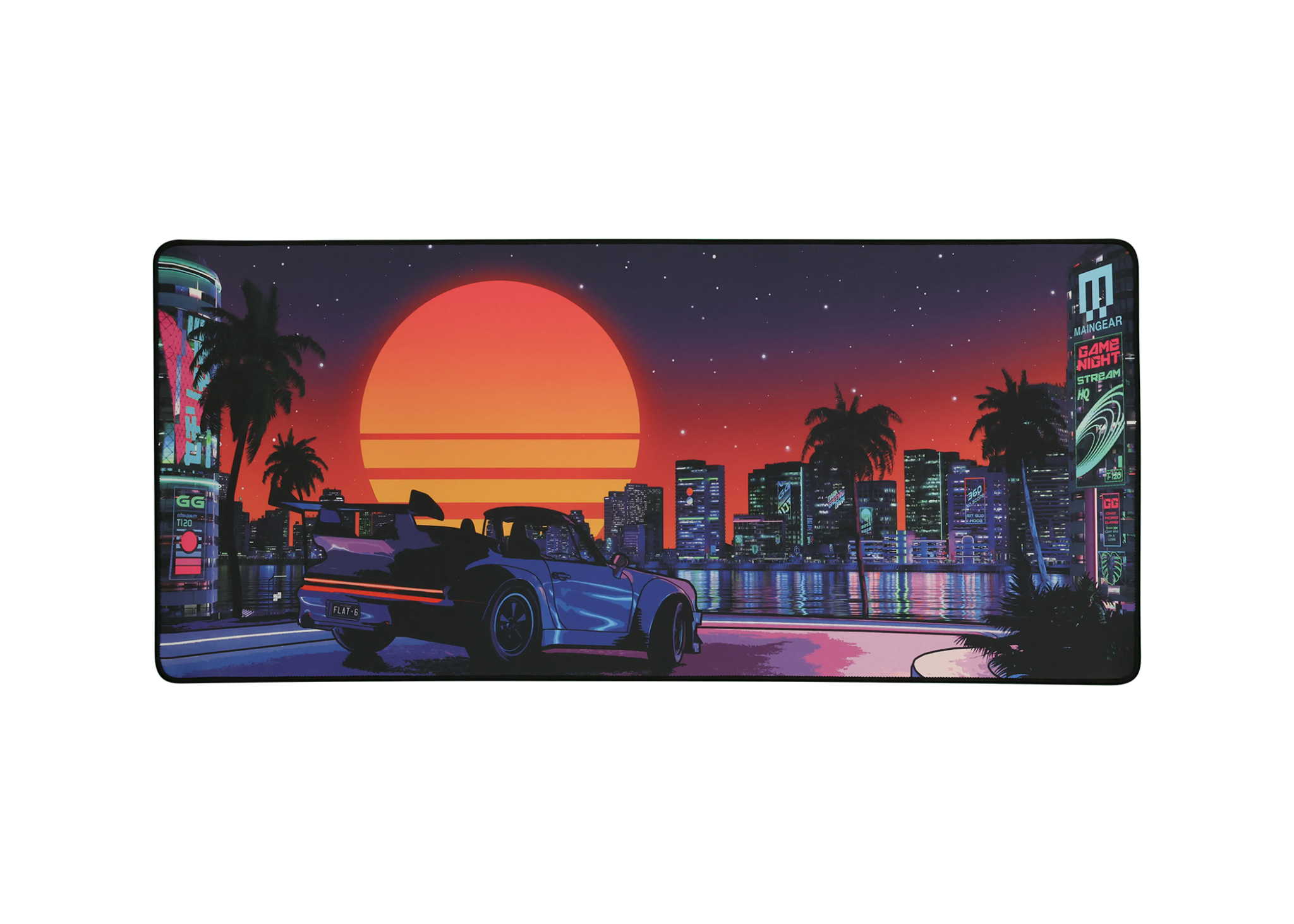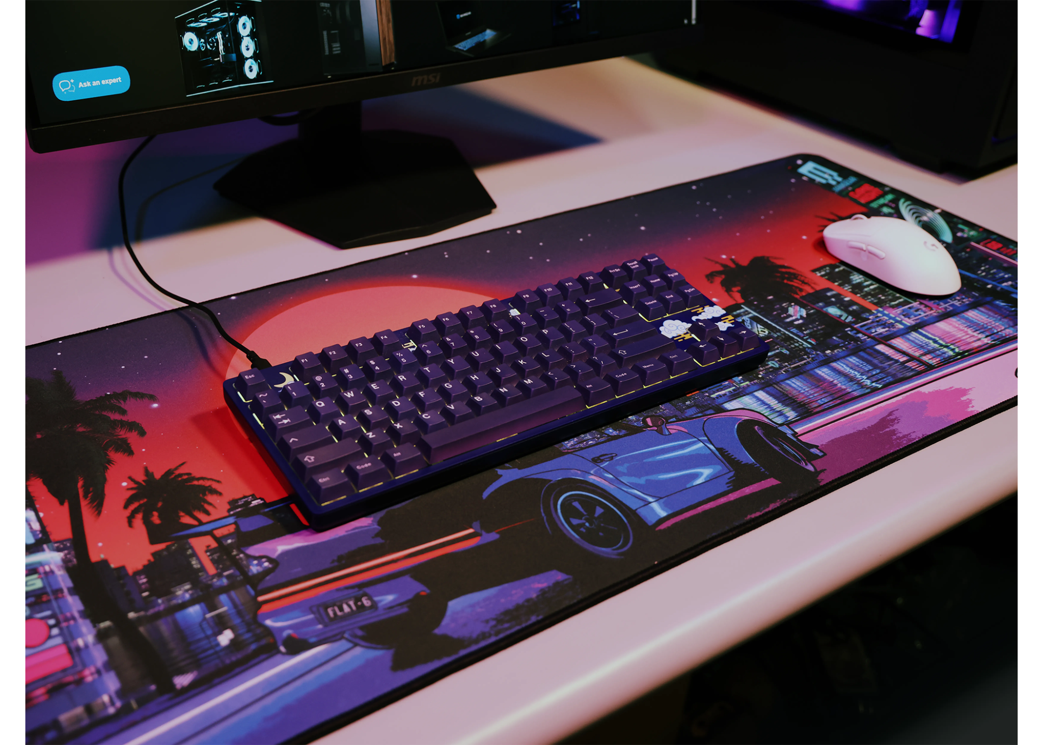Inspired by the RUSH | Night Drive, this design channels retro-futuristic vibes with neon-lit cityscapes, electric purples, and synthwave-inspired energy. It’s a late-night cruise through cyberspace, built for gamers who want their setup to look as fast and fierce as their playstyle. Clean lines, bold colors, and that unmistakable glow give your battle station a distinct edge.